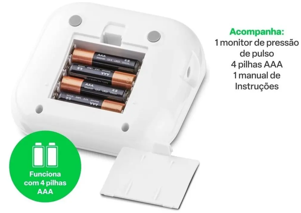 Para sua conveniência, o Monitor Arterial de Pulso da linha Multi Saúde opera com 4 pilhas AAA. Isso garante uma longa duração da bateria, para que você possa usá-lo sem preocupações por um período prolongado.