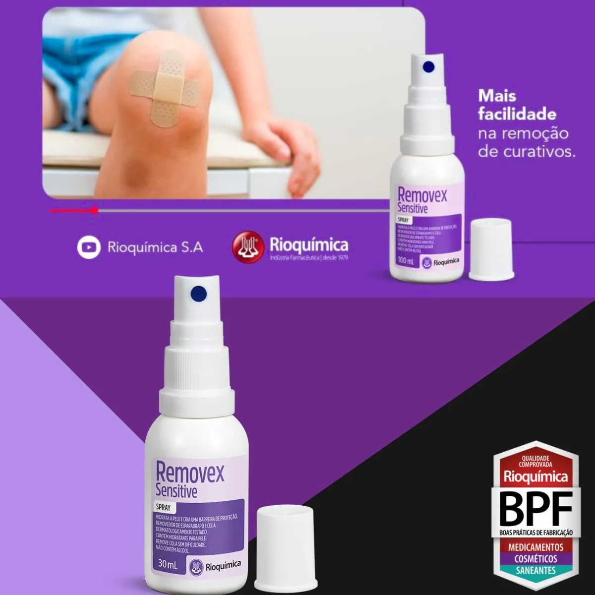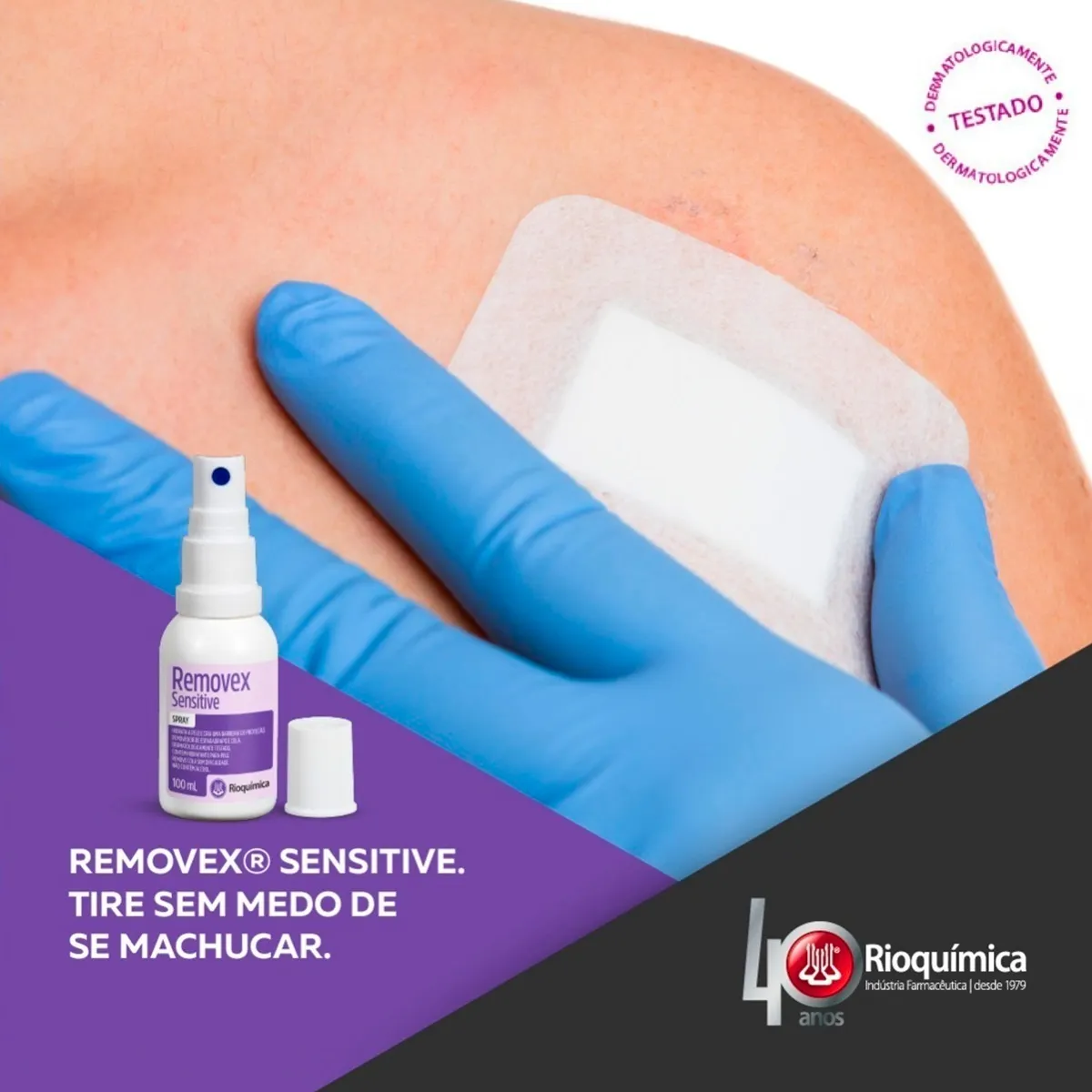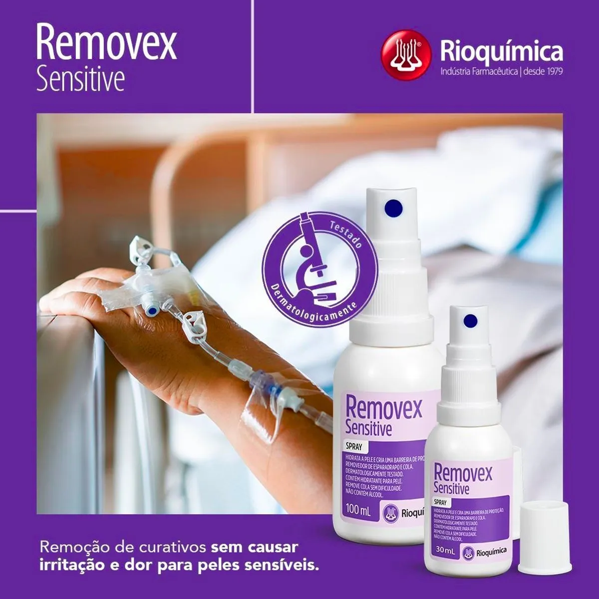O Removex Sensitive 30ml da Rioquímica é um spray removedor de adesivos médicos e curativos, formulado para peles sensíveis, que age dissolvendo a cola sem causar dor ou ardência, pois não contém álcool ou éter, sendo hipoalergênico, dermatologicamente testado e hidratante, ideal para remover esparadrapos, filmes e resíduos de colas de curativos e bolsas de estomia de forma suave e eficaz.
